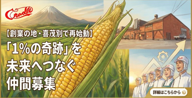 1932年、喜茂別町から始まったクレードル興農の物語 。今、創業の地を舞台に、品質・生産体制・働く環境のすべてをアップデートする「新しい工場づくり」が始まっています 。 私たちが守り抜くのは、国内流通量のわずか1.0%しかない希少な北海道産コーン 。この「1%の奇跡」とも言えるおいしさを食卓へ届け続けることが、私たちの使命です 。 新工場はゴールではなく、次の挑戦へのスタートライン 。北海道の食の未来を、一緒に育てていきませんか?